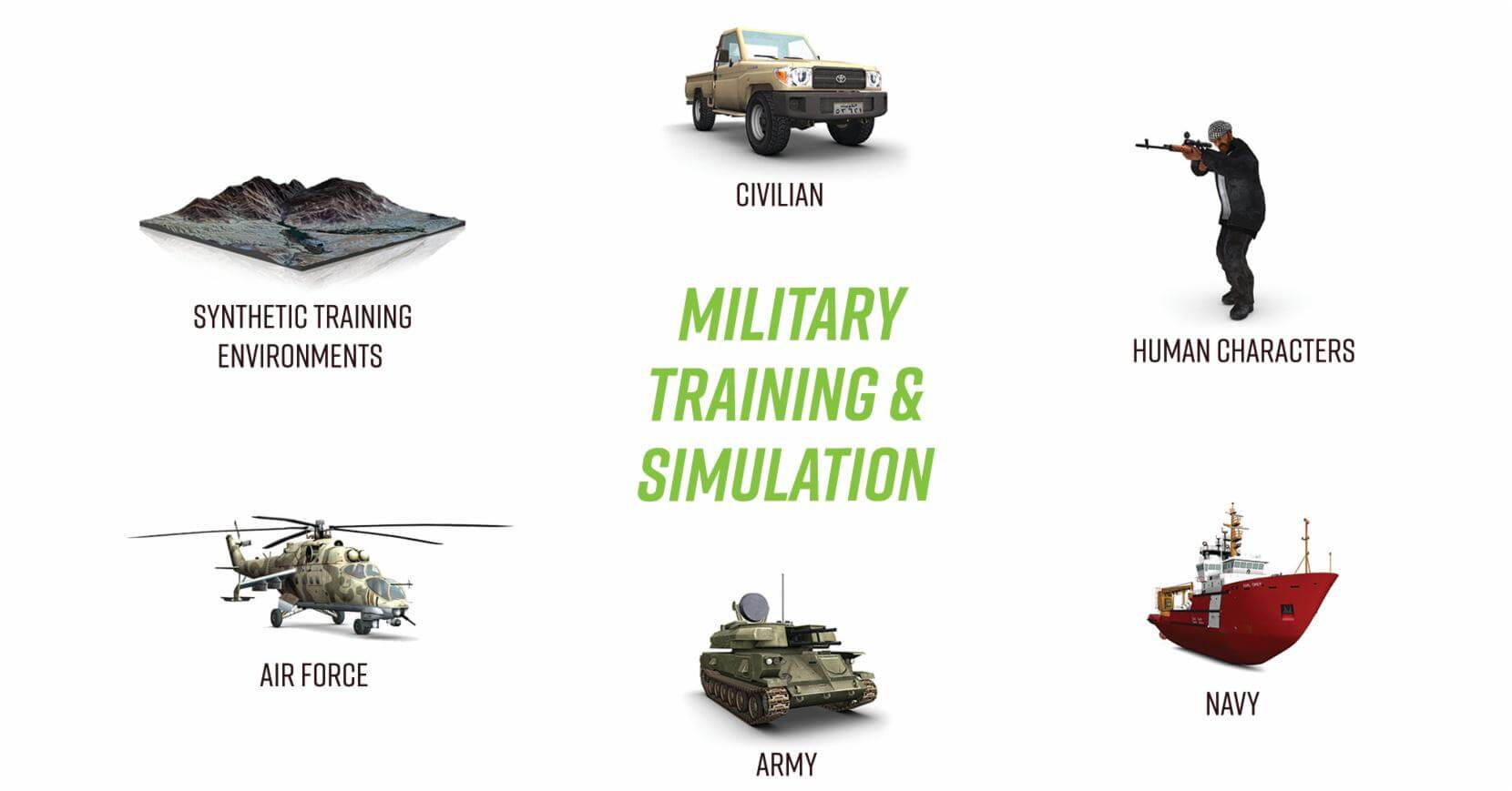 Simthetiq has been helping Armed Forces around the world improve their virtual training for over a decade. They have acquired expertise and understanding to develop, support and bring solutions to their clients. Simthetiq provides the largest military-specific simulation entity library, which is compatible with all industry standard image generators and DIS/HLA protocols. Using proprietary processes to accelerate modelling and integration they provide mission-ready, high-quality and customizable visual content to major corporations and military organisations around the world.
